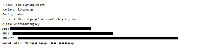 안드로이드 스튜디오 gradle탭에서 내 앱 패키지 ID > Tasks > android > signingReport 를 실행
