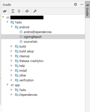 안드로이드 스튜디오 gradle탭에서 내 앱 패키지 ID > Tasks > android > signingReport 를 실행