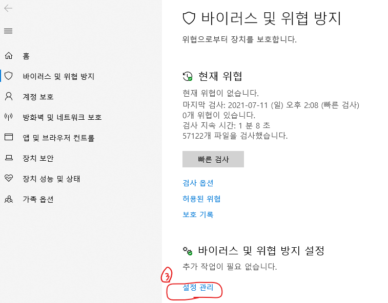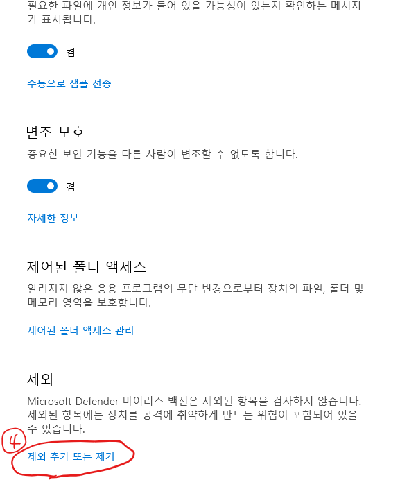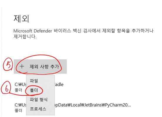안드로이드 스튜디오에 위와 같은 메시지가 매번 떠서 귀찮다. 빌드 과정에서는 파일의 변경이 많은데, 이 파일들이 변경될 때 백신 프로그램이 실시간으로 검사하기 때문에 성능을 위해 백신 프로그램에서 제외처리 하라는 것이다. 사용하는 백신마다 방법이 다르다. 윈도우 디팬더에서는 아래 이미지들 순서대로 진행한다.